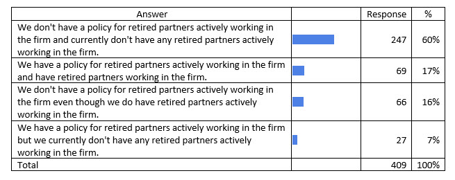 A total of 76% (60% + 16%) of responding firms don’t have a policy as to the possible roles, pay, and accountability for retired partners. In our experience all partners are reasonable when the discussion about rights and privileges is not about them, but rather, about others sitting at the table who might elect such an option. Therefore, the best time to put policies in place clarifying acceptable roles and pay for retired partners is when no one is on the verge of retirement. At the point that someone is in their last few years before retirement, this discussion seems to be more personal for the retired partner who may view it as if the policy is being created to limit and/or punish them. This situation makes the discussion as to best practices in this area far more difficult to have and typically results in a much less functional solution.