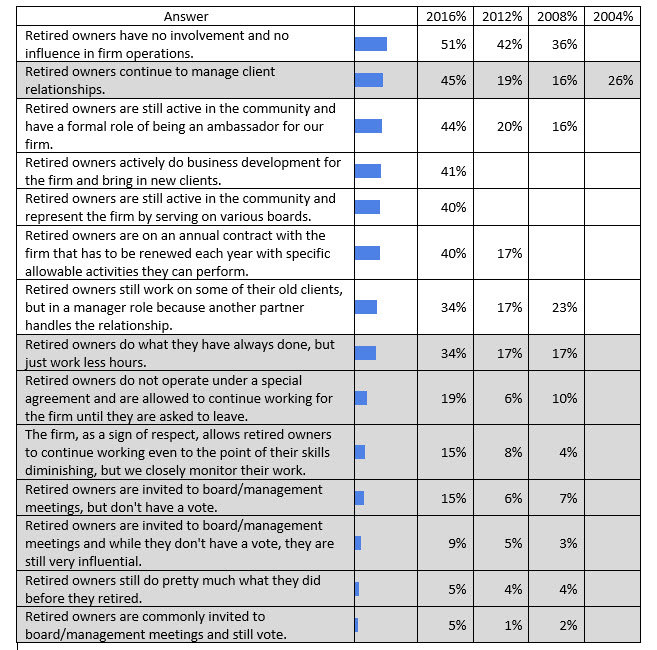 We see many good trends in the responses to this question. This is an example of firms making progress on their succession planning; even though many don’t have a succession plan, they are addressing critical succession issues. But what is interesting is that all of the statistics are trending up, both good and bad. Rather than list all those that are good and then do the same with those that are bad, we have highlighted in gray those practices that we believe should be stopped. For example, retired partners should be removed from the management of the firm so that the younger leadership can take over (and if the old guard leadership is still in attendance of those meetings, they can’t help themselves but to try and influence, and sometimes bully, the younger owners into doing what the firm has always done), so they shouldn’t attend board meetings and they certainly shouldn’t have a vote. As well, as we have stated before, retired owners should be directed as to what activities they should focus on post-retirement as well as removed from many duties, so allowing retired owners to do similar work to active owners will eventually undermine any firm’s succession efforts.