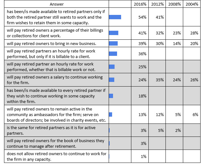 Finally, while the practice of “paying a partner by the hour for both billable and non-billable work” is shaded, it is only shaded due to the strictest interpretation of the response. There is nothing wrong with paying retired partners an hourly rate to serve in non-billable roles filling strategic issues such as training, sitting on boards, or doing special projects for the firm. Actually, we recommend doing this as part of the annual contract – specifically identify non-billable projects, create a budget for those functions, and pay an hourly rate. However, we often see the negative version of this practice most often where firms simply pay an hourly rate for all of the time that the retired partner sits in his or her office without regard to what they are doing or whether what they are doing is even of value to the firm.