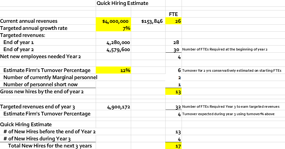 Given the current understaffing at many firms, together with data gathered from the survey, we have developed the following, simple “Quick Hiring” spreadsheet. This gives our firms a rough estimate of what they need to do to alter their current path. The bad news is … the spreadsheet can easily present a solution that seems totally unreasonable due to the number of new hires it shows under normal assumptions.